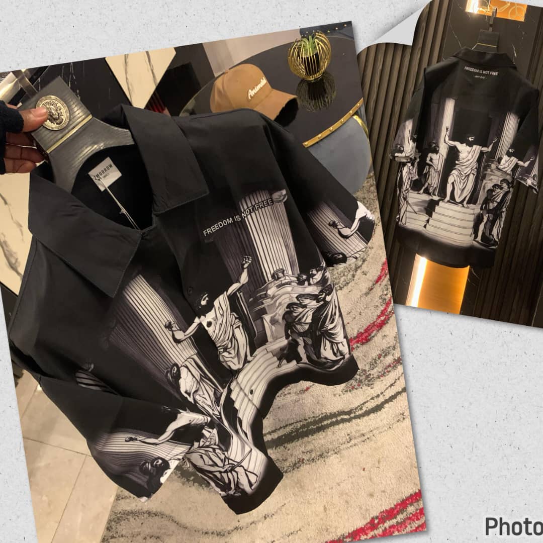 This black short-sleeve shirt from the “2morrow” brand features several distinct white graphic prints on the front and sleeves. The prints include celestial and eye-like motifs, giving the shirt a unique and artistic look. The back of the shirt features text that reads, “2M STUDIOS”. This button-down shirt offers a stylish and comfortable fit, perfect for a modern streetwear look.