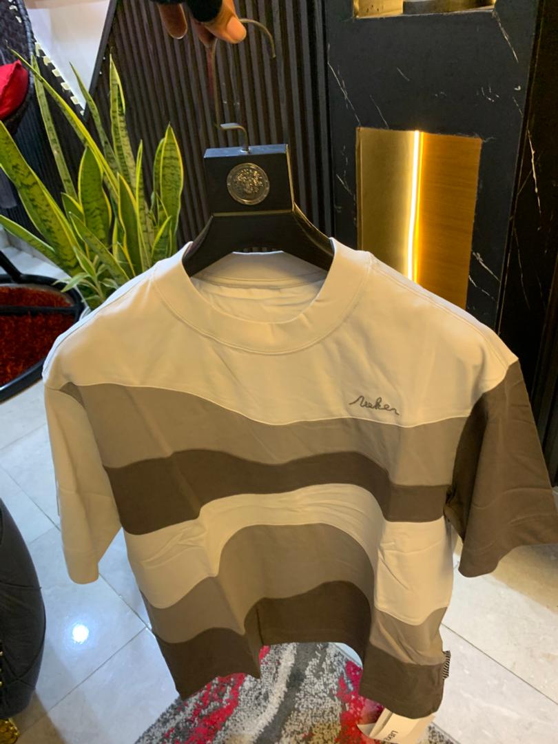 This premium t-shirt, possibly from the brand (based on visible chest embroidery), features a unique and eye-catching horizontal color-block design. The sections are separated by wavy, undulating lines rather than straight seams, creating a distinctive look. The color way includes a top section that appears Off-White/Cream, a middle section in Light Grey, and a bottom section in a Dark Brown or Deep Khaki shade. It has a standard crewneck and a relaxed, comfortable fit, making it a perfect statement piece for modern streetwear.