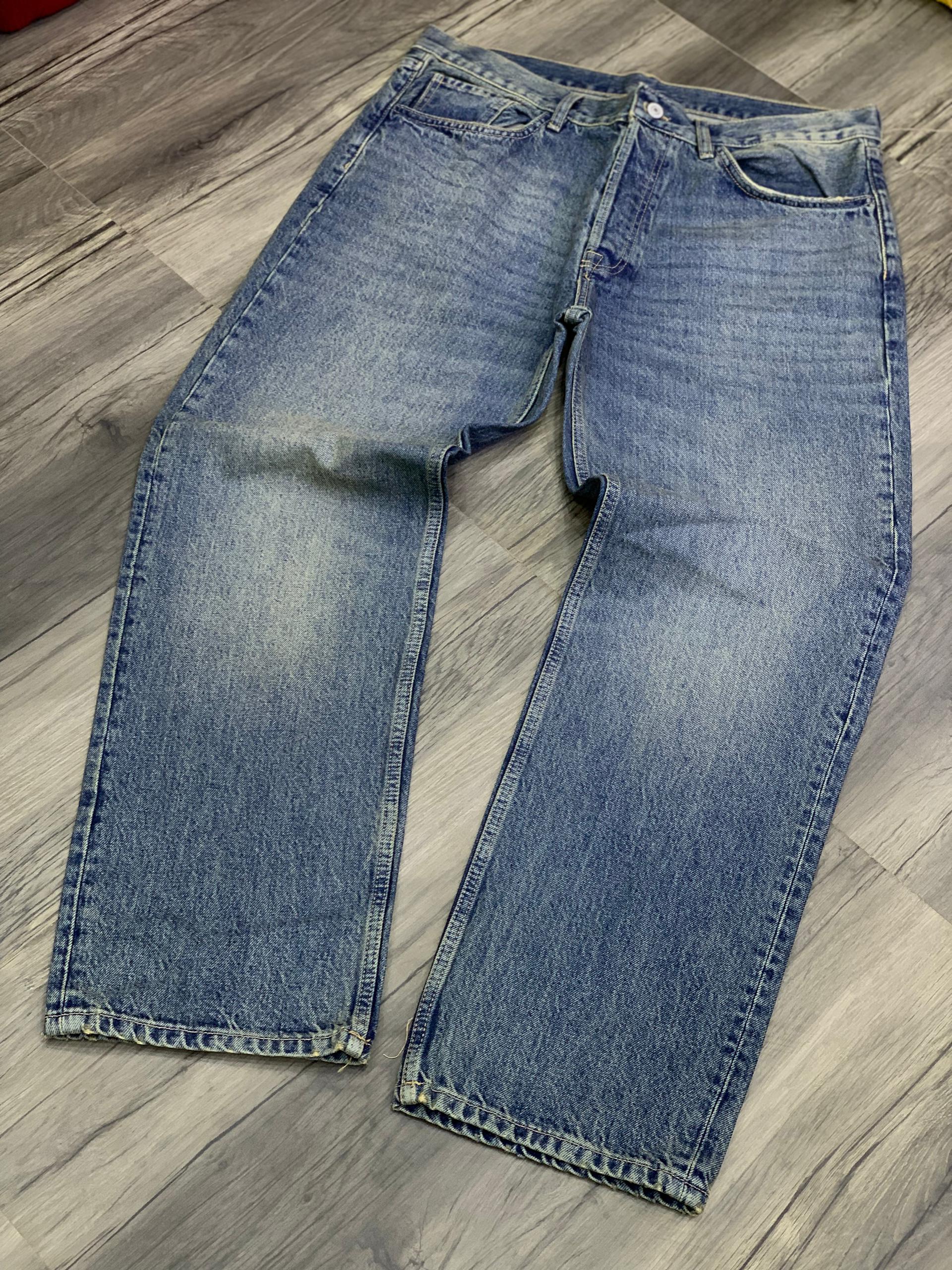 These light-wash baggy jeans from Turkey have a relaxed fit and feature multi-color distressing on the front. They have a classic five-pocket design.