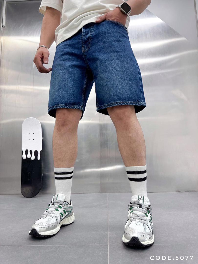 These mid-blue denim shorts, manufactured in Turkey, feature a distressed look with multiple ripped details on the front. They have a classic five-pocket design, a button fly closure, and a raw, frayed hem. The shorts have a relaxed fit and are suitable for casual, everyday wear.
