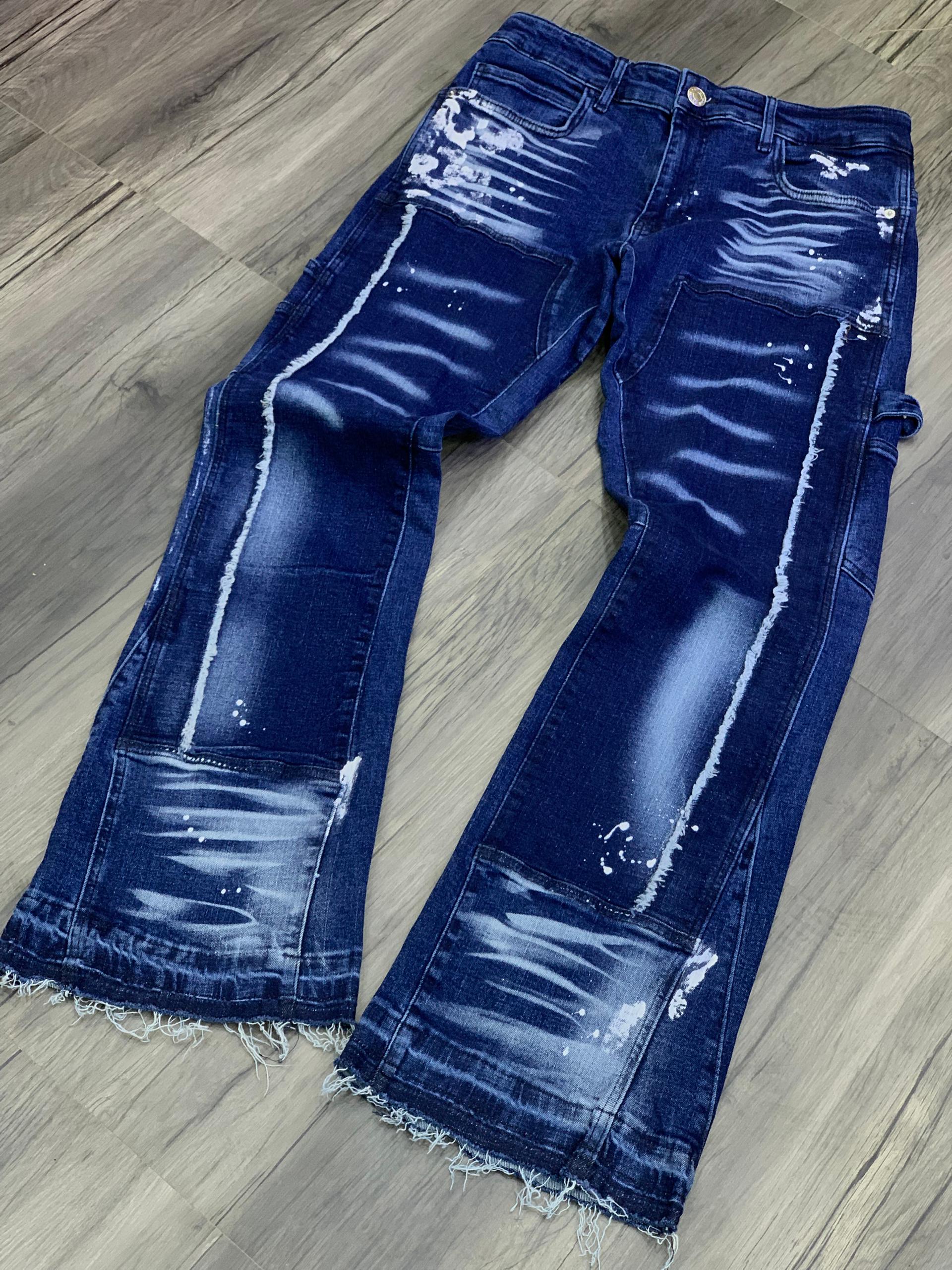 These light blue, bootcut jeans from Turkey Riches Paris have a distinct acid-wash effect with a slight fade and white paint splatters. A distressed vertical seam runs down each leg, giving them a retro-inspired, flared fit. They are available in a size range from 29 to 36.